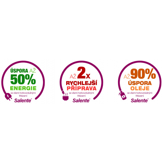 Horkovzdušná fritéza Salente AirFit splňuje současné nejvyšší nároky na zdravou a rychlou přípravu pokrmů a nabízí kombinaci hned několika způsobů přípravy od fritování a grilování, přes sušení až po rozmrazování. I těm nejnáročnějším kuchařům a kuchařkám umožňuje nastavení teploty v rozsahu 30-200 °C v krocích po 1 °C a nastavení času přípravy pokrmu v rozsahu 1-60 minut v krocích po 1 minutě.