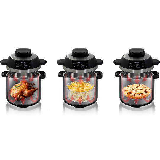 Horkovzdušná trouba, která je součástí balení, peče shora. Díky hornímu ohřevu dokážete připravit například menší kuře s křupavou kůžičkou, hranolky nebo koláč. Horkovzdušnou troubu můžete použít i jako doplněk po takovém vaření třeba jen k zapečení jídla.