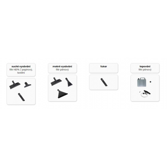 Součástí balení vysavače Combo 4v1 je několik filtrů, jejichž použitím nebo kombinací získáte pokročilou filtraci. Vysavač je v základu vybaven velkým omyvatelným HEPA filtrem, který můžete kombinovat s papírovým prachovým sáčkem a docílit tak nejlepší možné filtrace. Pro vysávání hrubších nečistot nebo například pro práci v dílně nebo exteriéru je možné využít textilní sáček. Pro mokré sání je zase vhodný pěnový filtr, který je rovněž součástí balení.