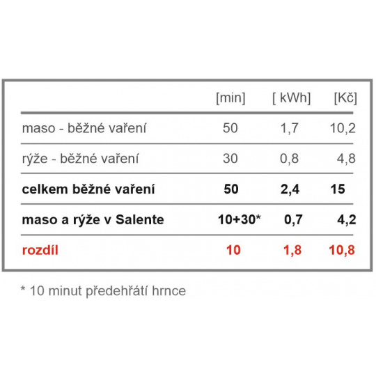 Vařením hlavního chodu s přílohu v tlaku v jednom hrnci, při průměrném vaření třikrát týdně a ceně elektrické energie 6 Kč/kWh ušetří za rok 1 700Kč. V tabulce je uveden příklad vaření hovězích plátků na houbách s natural červenou rýží vařených běžným způsobem na dvou plotýnkách elektrického vařiče s příkonem 1600 a 2000 W. Dále je v tabulce uveden příklad vaření téhož jídla v hrnci Salente, který ušetří při jednom vaření částku 10,8 Kč a zkrátí čas vaření o 10 minut. Další peníze ušetří hrnec Salente při fritování. Multifunkční hrnec je tepelně izolován a vyhřívá menší objem, než klasická trouba