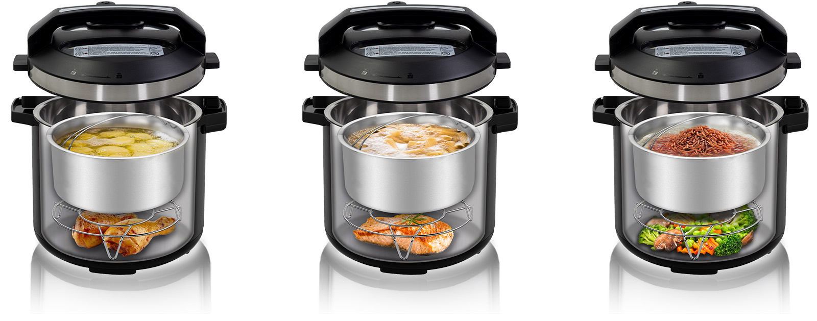 • 11v1: tlakový hrnec, pomalý hrnec, rýžovar, jogurtovač, vařič vajíček, ohřívač jídla, pánev na smažení nebo restování, napařovací hrnec, sterilizátor, hrnec na zavařování, hrnec na sous-vide