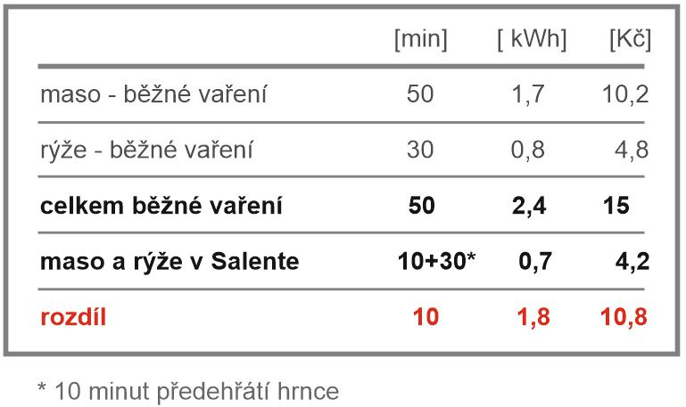 Vařením hlavního chodu s přílohu v tlaku v jednom hrnci, při průměrném vaření třikrát týdně a ceně elektrické energie 6 Kč/kWh ušetří za rok 1 700Kč. V tabulce je uveden příklad vaření hovězích plátků na houbách s natural červenou rýží vařených běžným způsobem na dvou plotýnkách elektrického vařiče s příkonem 1600 a 2000 W. Dále je v tabulce uveden příklad vaření téhož jídla v hrnci Salente, který ušetří při jednom vaření částku 10,8 Kč a zkrátí čas vaření o 10 minut. Další peníze ušetří hrnec Salente při fritování. Multifunkční hrnec je tepelně izolován a vyhřívá menší objem, než klasická trouba