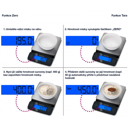 Funkce ZERO (nulování hmotnosti vážicí nádoby) & funkce TARA (postupné dovažování ingrediencí)