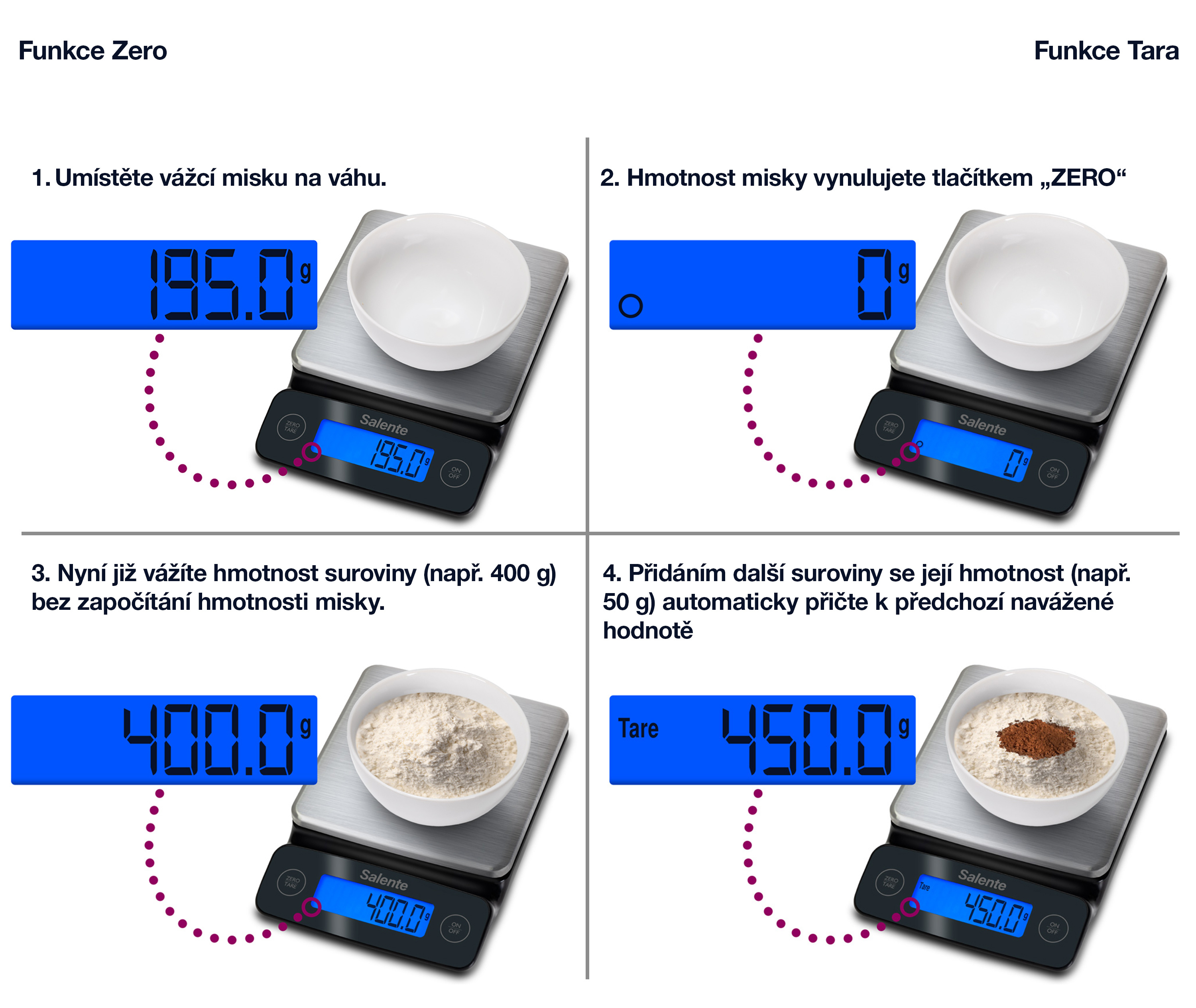 Funkce ZERO (nulování hmotnosti vážicí nádoby) & funkce TARA (postupné dovažování ingrediencí)