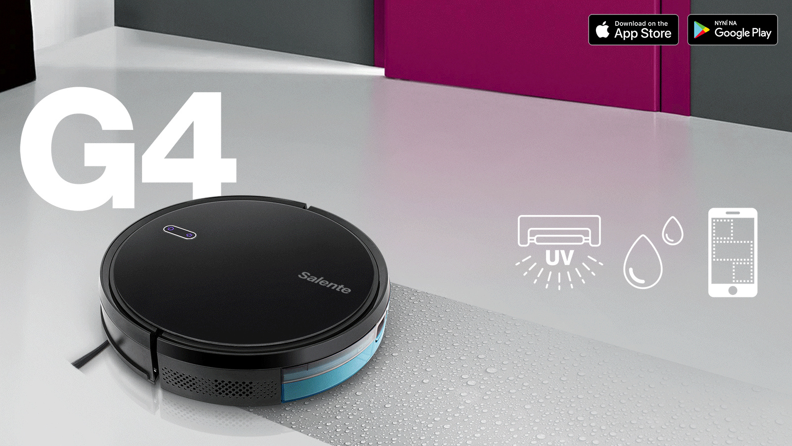 Salente G4 je schopen vaši podlahu vysávat, vytírat a desinfikovat pomocí vestavěné UVC lampy současně. Pomocí SMART gyroskopické navigace a snadné kontroly uklízeného prostoru pomocí mobilní aplikace v českém jazyce dokáže snadno, rychle a kvalitně uklidit váš členitý byt nebo dům a po ukončení úklidu se vrátit zpět do nabíjecí základny.
