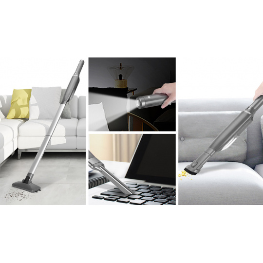 Multifunkční vysavač Salente HandyPlus je elegantní pomocník do vaší domácnosti. Ruční vysavač využijete například při úklidu drobného nepořádku na vaší sedačce nebo klávesnici. Prodloužením vysávacího potrubí získáte tyčový vysavač pro úklid podlahy. Odnímatelná baterie navíc disponuje velmi výkonnou LED svítilnou.
