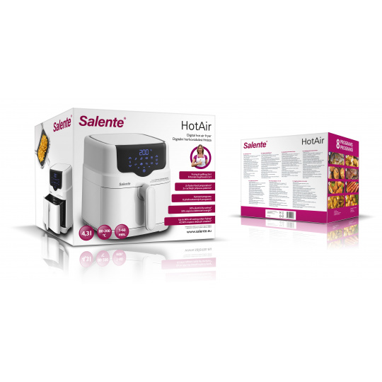 Horkovzdušná fritéza Salente HotAir splňuje současné nejvyšší nároky na zdravou a rychlou přípravu pokrmů a nabízí kombinaci dvou způsobů přípravy - fritování i grilování. I těm nejnáročnějším kuchařům a kuchařkám umožňuje nastavení teploty v rozsahu 80-200 °C v krocích po 1 °C a nastavení času přípravy pokrmu v rozsahu 1-60 minut v krocích po 1 minutě.