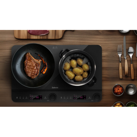 Každý pokrm vyžaduje jinou péči – někdy potřebujete jen jemné zahřívání, jindy pořádný žár. Obě plotýnky indukčního vařiče Salente InductPro2 vám proto nabízí 10 úrovní teploty (v rozsahu 60 až 240 °C) a 10 úrovní výkonu (až do 1300 W, resp. 1800 W). A pokud zrovna spěcháte, můžete se spolehnout na funkci Boost, která na 30 sekund zapne maximální výkon. Spolehlivý provoz tohoto kompaktního kuchyňského spotřebiče zajišťuje i autodiagnostika (monitorující případné problémy s indikací na displeji) nebo fakt, že ovládání i vaření je zde řízeno špičkovým mikroprocesorem.