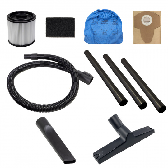 • Vysavač • Flexibilní vysávací hadice • Plastové vysávací trubice (3 ks) • Podlahová hubice • Štěrbinová hubice • Papírový prachový sáček • Textilní filtrační sáček • Pěnový filtr • HEPA filtr • Držadlo • Záklopka HEPA filtru • Pojezdová kolečka (4 ks) • Montážní vruty (6 ks) • Návod k obsluze (EN/DE/CZ/SK/HU/RO/IT/SLO)PŘÍPLATKOVÉ PŘÍSLUŠENSTVÍ: