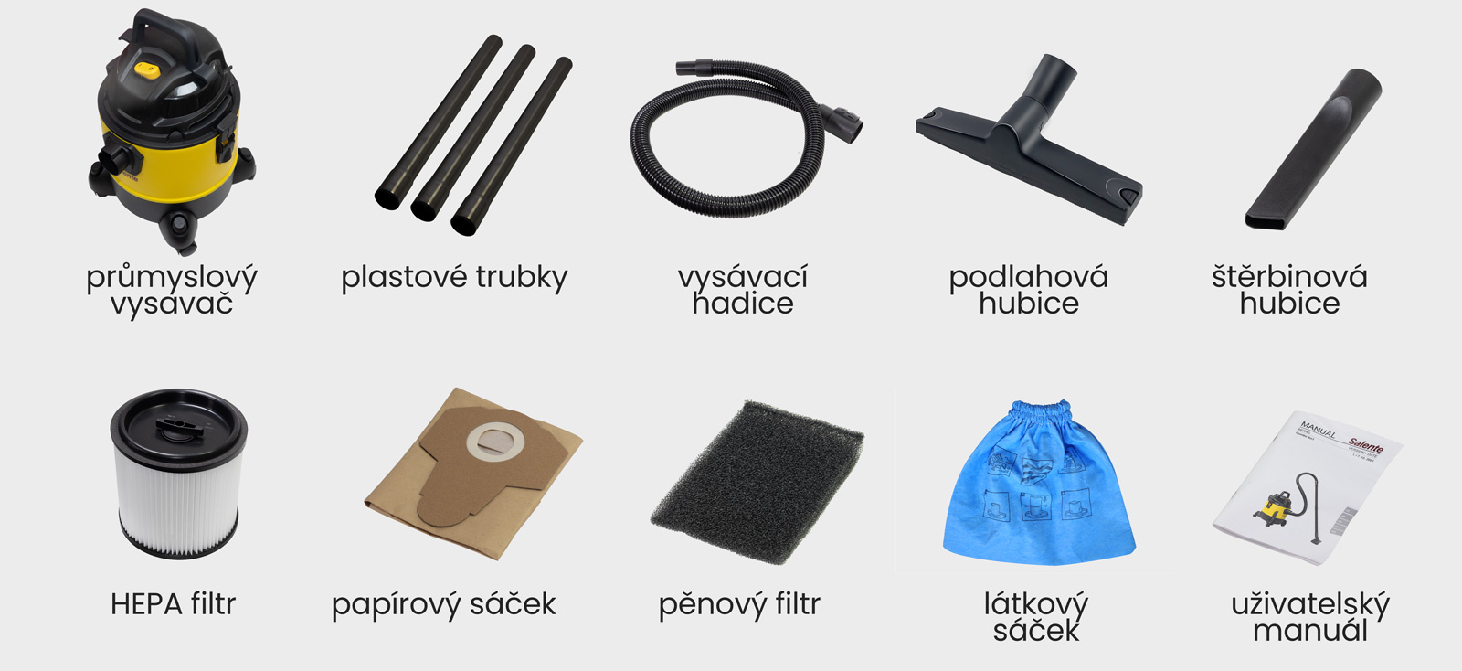 • Vysavač • Flexibilní vysávací hadice • Plastové vysávací trubice (3 ks) • Podlahová hubice • Štěrbinová hubice • Papírový prachový sáček • Textilní filtrační sáček • Pěnový filtr • HEPA filtr • Držadlo • Záklopka HEPA filtru • Pojezdová kolečka (4 ks) • Montážní vruty (6 ks) • Návod k obsluze (EN/DE/CZ/SK/HU/RO/IT/SLO)PŘÍPLATKOVÉ PŘÍSLUŠENSTVÍ: