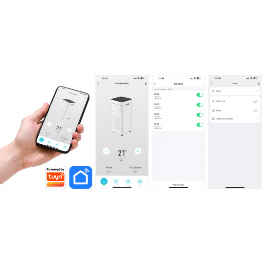 Klimatizaci je možné propojit s mobilním telefonem díky bezplatné aplikaci Tuya SmartLife, která je ke stažení jak pro mobilní telefony iPhone, tak pro všechny mobilní telefony se systémem Android. Vybrat si můžete ze dvou způsobů připojení – WiFi nebo Bluetooth.