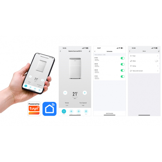 Klimatizaci je možné propojit s mobilním telefonem díky bezplatné aplikaci Tuya SmartLife, která je ke stažení jak pro mobilní telefony iPhone, tak pro všechny mobilní telefony se systémem Android. Vybrat si můžete ze dvou způsobů připojení – WiFi nebo Bluetooth. Mobilní aplikace nabízí tyto možnosti ovládání a přehledů: