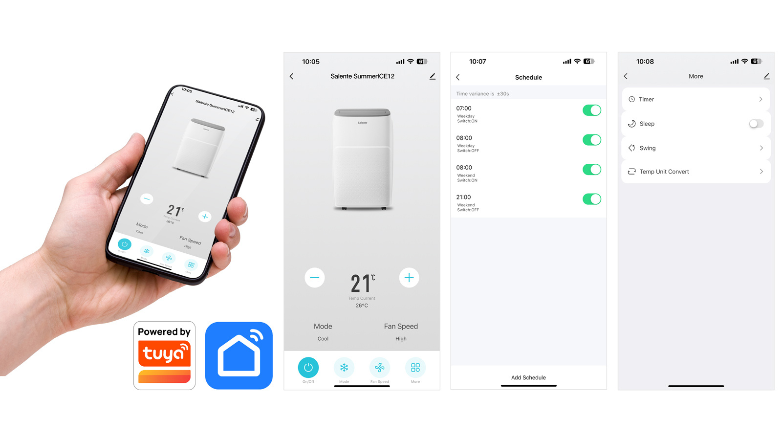 Klimatizaci je možné propojit s mobilním telefonem díky bezplatné aplikaci Tuya SmartLife, která je ke stažení jak pro mobilní telefony iPhone, tak pro všechny mobilní telefony se systémem Android. Vybrat si můžete ze dvou způsobů připojení – WiFi nebo Bluetooth. Mobilní aplikace nabízí tyto možnosti ovládání a přehledů: