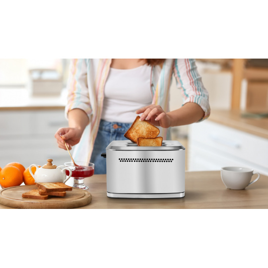 S digitálním displejem a paměťovou funkcí se opékání pečiva stane zábavou. Topinkovač má v paměti uložených 7 různých druhů pečiva, takže stačí jen jedním dotykem pohodlně zvolit ten správný a o nic dalšího se nemusíte starat. Topinkovač sám nastaví dobu opékání potřebnou pro dané pečivo. K dispozici jsou navíc 4 uživatelské paměťové pozice, kam si můžete uložit svůj oblíbený druh pečiva a intenzitu opečení – pak už jen stačí vybrat jednu ze 4 uložených předvoleb a je hotovo.