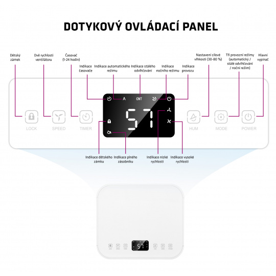 • Bez nutnosti odborné montáže • Ekologický (neobsahuje žádné toxické náplně poškozující ozonovou vrstvu) • Vhodný i pro nepřetržitý provoz • Odvlhčovací kapacita: 12 litrů/den • Pro místnosti až 60 m2 • Vyjímatelná nádržka na vodu (objem 2 litry) • Ultratichý provoz (36 dB při nízkých otáčkách ventilátoru) • Možnost nastavení cílové vlhkosti v rozsahu 30-80% v krocích po 5% • Automatické vypnutí v případě naplnění nádržky na vodu • Možnost permanentního napojení na vodovodní odpad pomocí dodávané drenážní hadičky • Inteligentní AntiFreeze technologie zamezující zamrznutí • Beztlačítkové dotykové ovládací senzory pro snadnou obsluhu a dlouhou životnost • Barevný LED indikátor na čelním panelu indikující 3 úrovně vlhkosti: 1) Modrá (vlhkost <45%) 2) Zelená (vlhkost 45-65%) 3) Červená (vlhkost >65%) • 24hodinový časovač pro automatické zapnutí nebo vypnutí s kroky po 60 minutách • 2 rychlosti ventilátoru (700/900 ot./min.) • Dětský zámek pro zablokování ovládacího panelu • Funkce AutoRestart pro případ výpadku proudu • Digitální displej • 3 režimy provozu: 1) Automatický režim s možností nastavení požadované cílové vlhkosti 2) Režim stálého odvlhčování (ideální např. při sušení prádla) 3) Noční režim (tichý provoz na nižší otáčky ventilátoru a snížený jas displeje) • Permanentní omyvatelný vzduchový filtr eliminuje víření prachu a filtruje mechanické nečistoty • Funkcionalita ovládacího panelu s LED displejem: 1) zobrazení aktuální a cílové vlhkosti 2) indikace provozu 3) indikace aktivního automatického režimu 4) indikace režimu stálého odvlhčování 5) indikace aktivního nočního režimu 6) indikace aktivního časovače 7) indikace aktivního dětského zámku 8) indikace rychlosti ventilátoru 9) indikace plného zásobníku 10) dotykový ovládací senzor pro zapnutí/vypnutí odvlhčovače 11) dotykový ovládací senzor pro volbu rychlosti ventilátoru 12) dotykový ovládací senzor pro aktivaci nočního režimu/resetu filtru 13) dotykový ovládací senzor pro aktivaci/deaktivaci dětského zámku 14) dotykový ovládací senzory pro snížení/zvýšení hodnoty cílové vlhkosti a časovače 15) dotykový ovládací senzor pro aktivaci/deaktivaci časovače 16) dotykový ovládací senzor pro výběr provozního režimu • Ekologický plyn R290 (bezfreonový plyn s nulovým koeficientem rozpadu ozónu) • Průtok vzduchu: 120 m3/hod. • 4 pojezdová kolečka • Autodiagnostika s indikací chybových hlášení na displeji • Délka drenážní hadičky: 1 m • Evropské certifikace LVD, EMC, RoHS • Délka přívodního kabelu: 1,5 m • Hlučnost při nízkých otáčkách ventilátoru: 36 dB • Hlučnost při vysokých otáčkách ventilátoru: 38 dB • Jmenovité napětí: AC 220-240 V • Jmenovitý kmitočet: 50 Hz • Jmenovitý příkon (při teplotě 27 °C a relativní vlhkosti 60%): 172 W • Jmenovitý proud (při teplotě 27 °C a relativní vlhkosti 60%): 1,1 A • Jmenovitý příkon (při teplotě 30 °C a relativní vlhkosti 80%): 200 W • Jmenovitý proud (při teplotě 30 °C a relativní vlhkosti 80%): 1,2 A • Typ a hmotnost chladiva: R290 (50 g) • Rozměry (š × h × v): 255 × 220 × 445 mm • Hmotnost: 10 kgOBSAH BALENÍ: