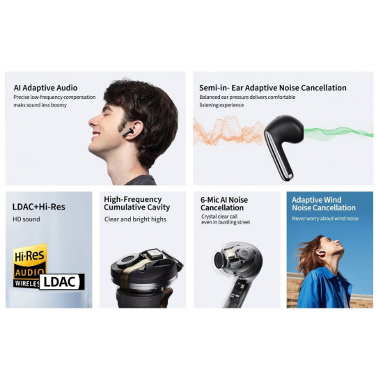 Po zapnutí ANC se bezdrátová sluchátka automaticky přizpůsobí vašemu zvukovodu, dynamicky detekují změny okolního hluku a stavu nošení a dynamicky upravují a přizpůsobují nejvhodnější parametry potlačení hluku v reálném čase, čímž zajistí, že okolní hluk je účinně eliminován. Konstrukce také zahrnuje vodotěsnou a adaptivní strukturu proti větru IPX5, takže jsou ideální pro outdoorové aktivity.