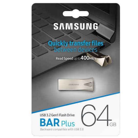 Datové úložiště, které se dá snadno přenášet. USB flash disk Samsung USB 3.2 Gen1 64GB Bar Plus Champagne silver je nejvhodnějším prostředkem k zálohování a přenášení dat mezi vámi vybranými zařízeními. Jistě budete potěšeni obsahem uložiště 64 GB. K notebooku či PC se připojuje prostřednictvím USB 3,2 Gen 1 (USB 3,0).