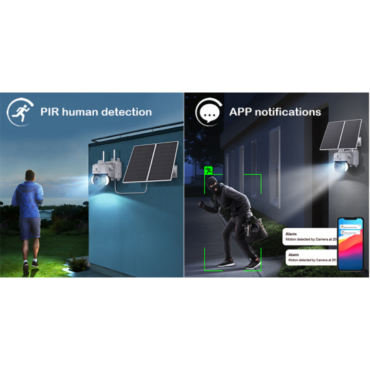 Otočný motorizovaný objektiv · ochrana IP66 · IR i barevné noční vidění až 30m · typ připojení 4G · TF/SD card uložiště · Cloud uložiště · Full HD 1080P rozlišení, výkon solárního panelu 20W max. · kapacita baterie 20000 mAh · PIR funkce · mobilní notifikace · ovládání přes mobilní aplikaci