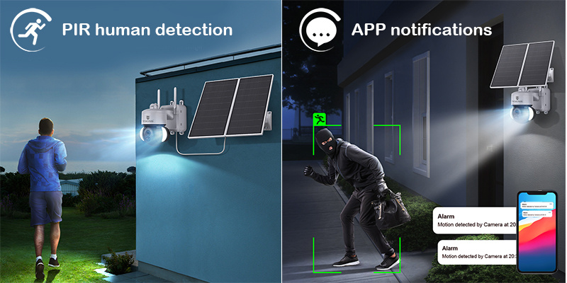 Otočný motorizovaný objektiv · ochrana IP66 · IR i barevné noční vidění až 30m · typ připojení 4G · TF/SD card uložiště · Cloud uložiště · Full HD 1080P rozlišení, výkon solárního panelu 20W max. · kapacita baterie 20000 mAh · PIR funkce · mobilní notifikace · ovládání přes mobilní aplikaci