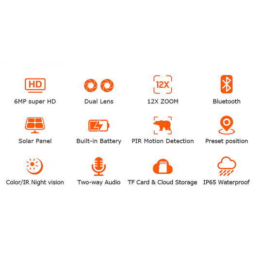 2304 x 1296 rozlišení · 4G připojení · 12x manuální zoom · PIR detekce - pohybový senzor · podpora TF karty až 128GB · cloudové úložiště · aplikace UBOX · kapacita baterie 7800 mAh · dvousměrný přenos zvuku · PTZ otočná kamera 355°/90° · solární napájení · mobilní notifikace · IR a bílé LED osvětlení · funguje pouze se SIM kartou 4G · ovládání přes mobilní aplikaci