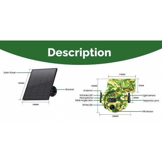 •Rozměry: Kamera 14,2 x 13,6 x 14,5 cm, Solární panel 18,3 x 16,8 cm