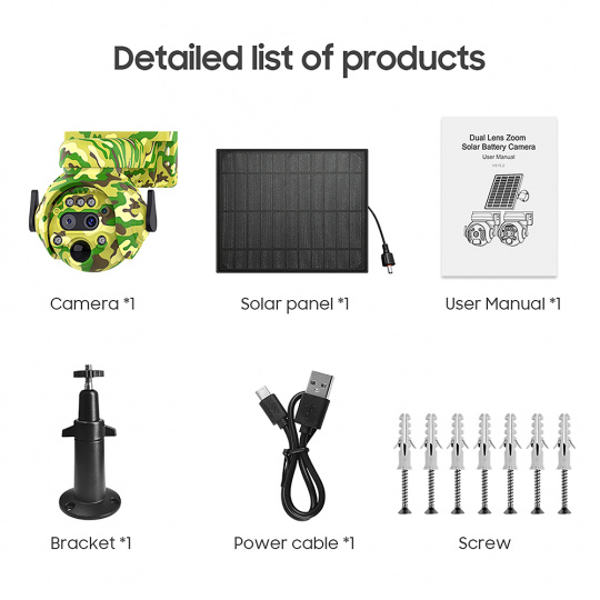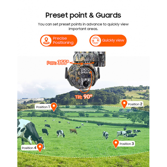 2304 x 1296 rozlišení · 4G připojení · 12x manuální zoom · PIR detekce - pohybový senzor · podpora TF karty až 128GB · cloudové úložiště · aplikace UBOX · kapacita baterie 7800 mAh · dvousměrný přenos zvuku · PTZ otočná kamera 355°/90° · solární napájení · mobilní notifikace · IR a bílé LED osvětlení · funguje pouze se SIM kartou 4G · ovládání přes mobilní aplikaci