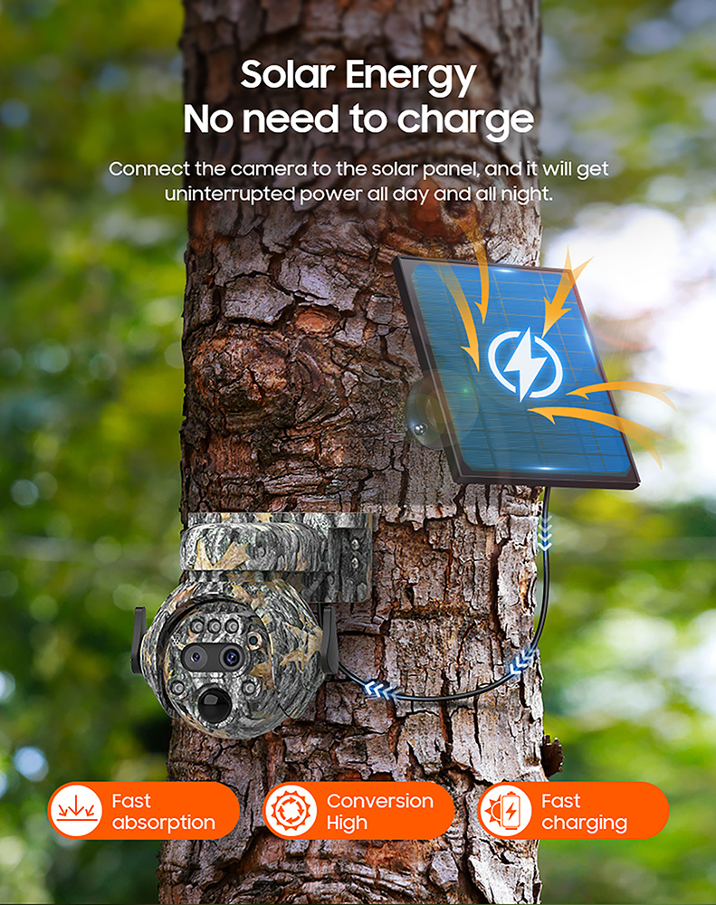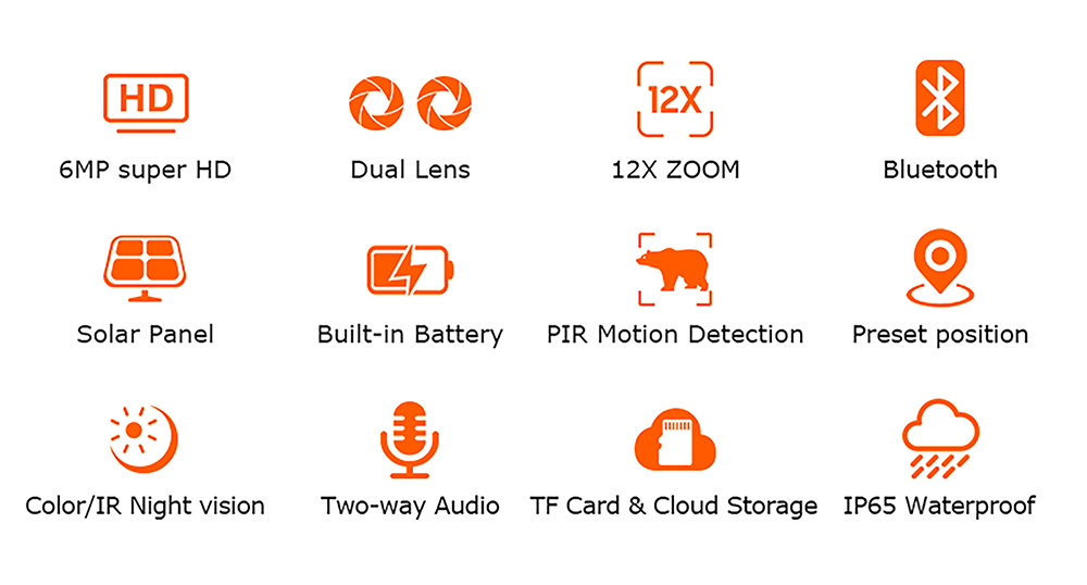 2304 x 1296 rozlišení · 4G připojení · 12x manuální zoom · PIR detekce - pohybový senzor · podpora TF karty až 128GB · cloudové úložiště · aplikace UBOX · kapacita baterie 7800 mAh · dvousměrný přenos zvuku · PTZ otočná kamera 355°/90° · solární napájení · mobilní notifikace · IR a bílé LED osvětlení · funguje pouze se SIM kartou 4G · ovládání přes mobilní aplikaci