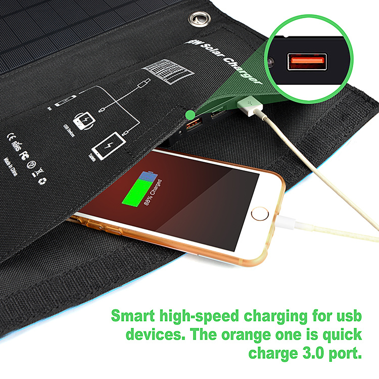 4. Díky okům po stranách, vodě odolného polyesterového plátna, je solární nabíječka snadno přichytitelná k čemukoliv, pro pohodlné nabíjení (k batohu, k tašce, ke kolu, na stan, atd.)
