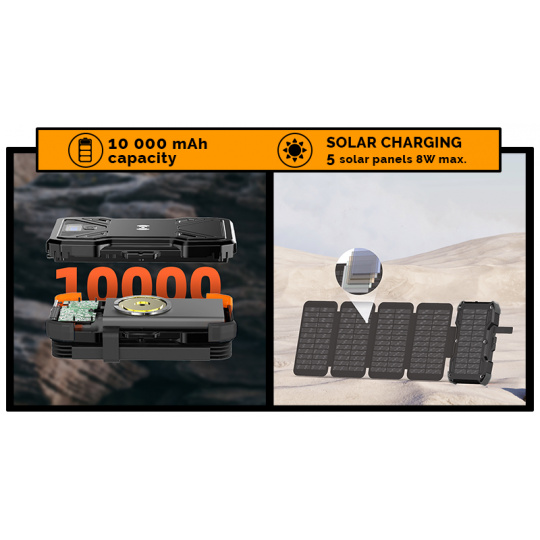 Solární powerbanka • Kapacita 10000mAh (37Wh) • podpora rychlonabíjení QC3.0 a Power Delivery • USB-C vstup až PD18W • USB-C výstup (PD20W max.) • 2 x USB-A výstup (QC22.5W max.) bezdrátové wireless nabíjení 15W max. • 5 solárních panelů 8W max • IP54 • LED svítilna