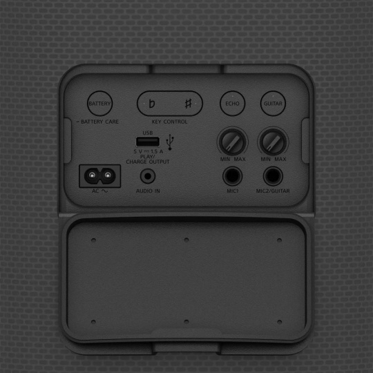 *Stereofonní minikonektor (vstup), USB A, 1 vstup pro mikrofon (6,3 mm), 1 vstup pro mikrofon/kytaru (6,3 mm)