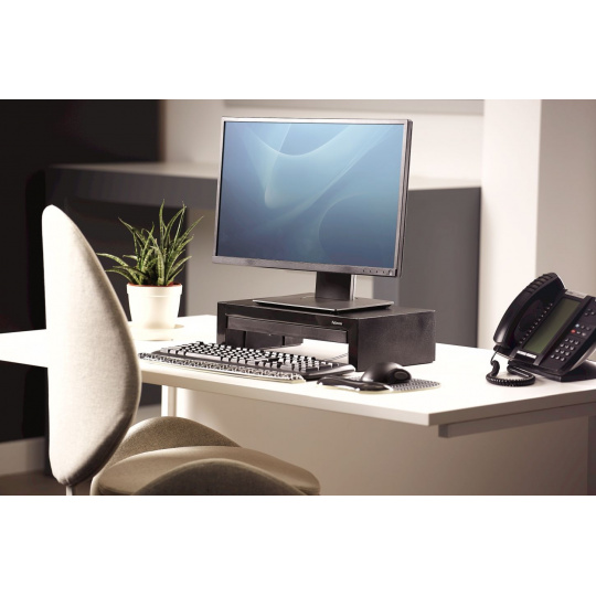 Používáním stojanu pod monitor Fellowes Designer Suites předcházíte bolesti šíje a krční páteře. Umožňuje nastavení monitoru do úrovně očí, čímž zmírňuje svalové napětí ramen a krku. Vhodné do kanceláře i domácnosti.
