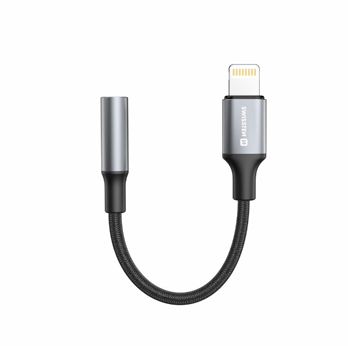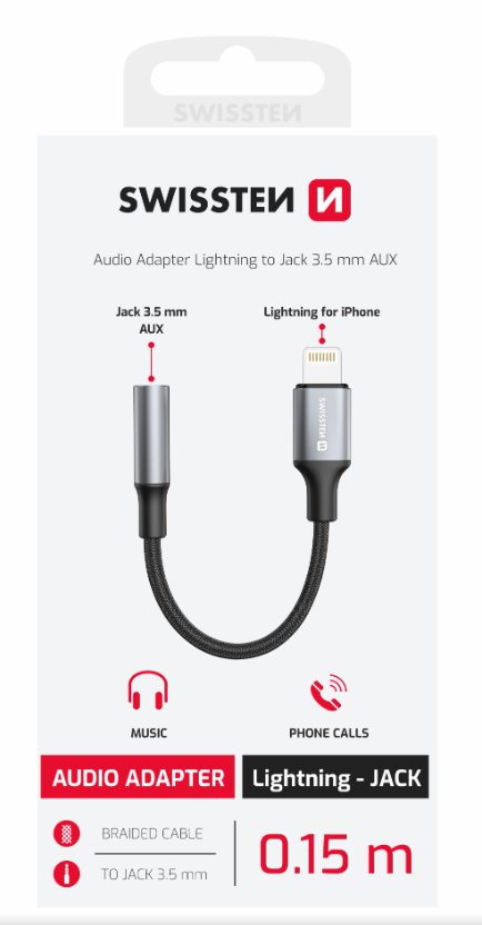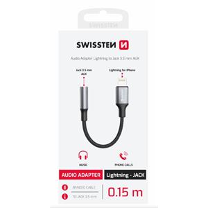 Audio adaptér SWISSTEN Textile LIGHTNING (samec) / 3,5mm AUX, Délka: 15 cm, Využití: Pro připojení sluchátek a reproduktorů k chytrým zařízením bez klasického audio jack vstupu, Textilní materiál. Baleno v blistru SWISSTEN.