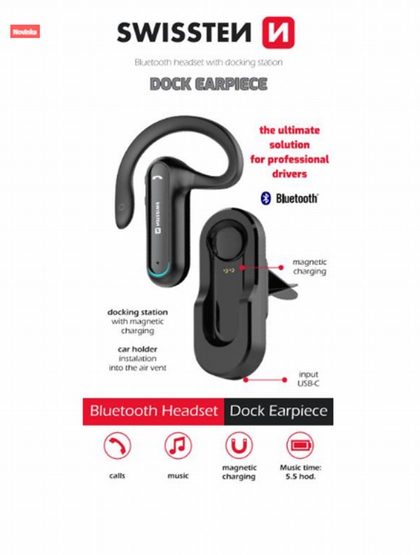 Ergonomický bluetooth headset SWISSTEN EARPIECE s dlouhou výdrží s dobíjecím držákem a magnetickým dobíjecím kabelem. Baleno v blistru SWISSTEN.
