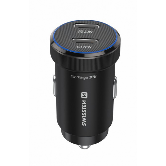 Praktická autonabíječka s dvojicí USB-C portů a podporou PD 3.0, dodávaná s prémiovým USB-C/USB-C kabelem (1 m, 60W, 3A, soft silicone). Modré LED podsvícení usnadňuje připojení i ve tmě.