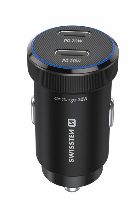 Praktická autonabíječka s dvojicí USB-C portů a podporou PD 3.0, dodávaná s prémiovým USB-C/USB-C kabelem (1 m, 60W, 3A, soft silicone). Modré LED podsvícení usnadňuje připojení i ve tmě.