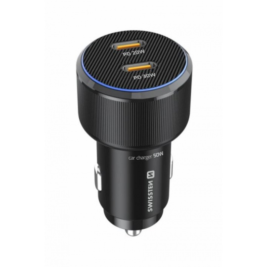 Výkonná autonabíječka s dvojicí USB-C portů a podporou PD 3.0, dodávaná s prémiovým USB-C/USB-C kabelem (1 m, 60W, 3A, soft silicone). Celkový výkon až 50W. Modrý LED kroužek pro snadné použití i za tmy.