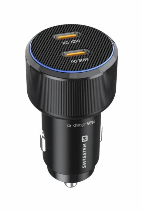 Výkonná autonabíječka s dvojicí USB-C portů a podporou PD 3.0, dodávaná s prémiovým USB-C/USB-C kabelem (1 m, 60W, 3A, soft silicone). Celkový výkon až 50W. Modrý LED kroužek pro snadné použití i za tmy.
