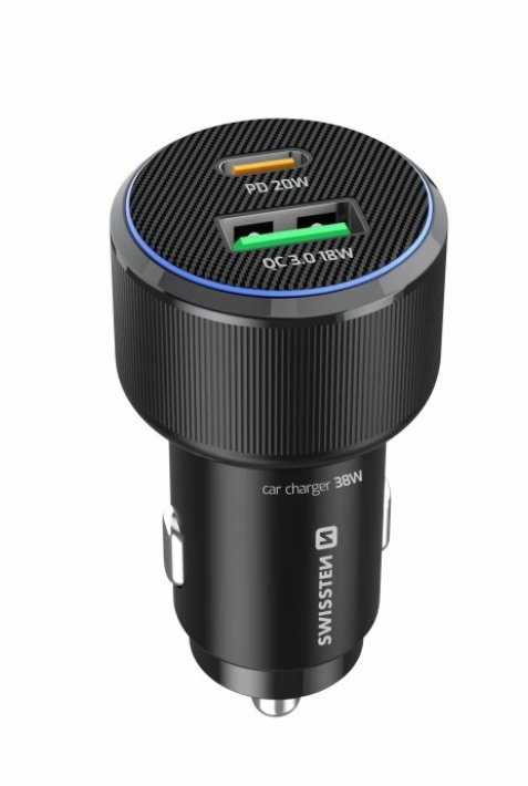 Praktická autonabíječka s podporou rychlého nabíjení PD 3.0 a QC 3.0, vybavená porty USB-C a USB-A. Součástí balení je 1m kabel USB-C/USB-C (3A, 60W, soft silicone) pro okamžité použití. Modré LED osvětlení v obvodu nabíječky usnadňuje připojení kabelu i při jízdě v noci.
