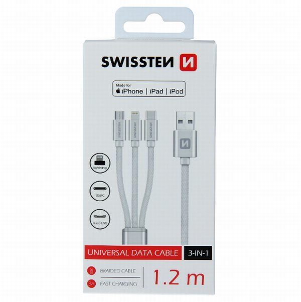 Univerzální datový kabel USB s délkou 1,2m. Disponuje všemi konektory. MicroUSB, USB-C a certifikovaný Lightning MFi. Díky tomu je vhodný pro všechny typy smartphonu. Baleno v blistru SWISSTEN.