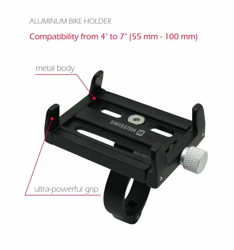 Držák SWISSTEN BC2 je vyroben z hliníku, jenž mu dodá nejen elegantní vzhled, ale i velkou odolnost při jízdě po nerovné silnici.