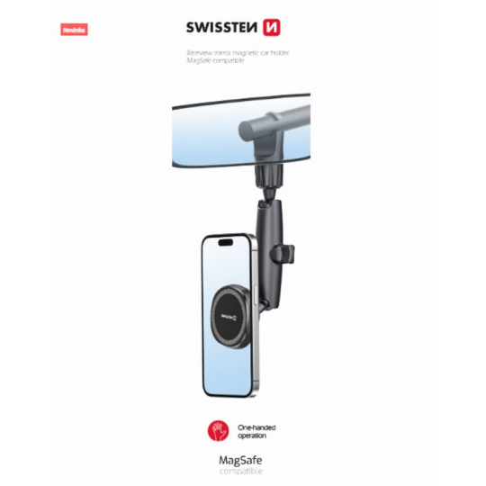 Držák SWISSTEN s technologií přichycení kompatibilní s Magsafe pro připevnění na zpětné zrcátko. Baleno v blistru SWISSTEN.