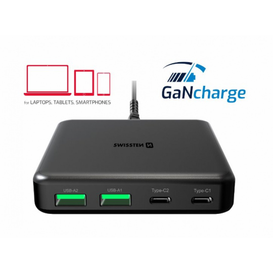 SWISSTEN MINI DESKTOP ADAPTÉR GaN 2x USB-C + 2xUSB 65W POWER DELIVERY ČERNÝ