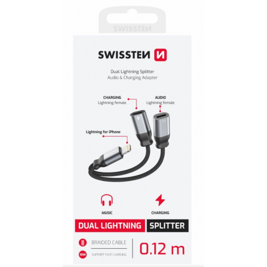 SWISSTEN NABÍJECÍ AUDIO ADAPTÉR TEXTILE LIGHTNING (samec) / 2x LIGHTNING (samice) 0,12 M ČERNÝ
