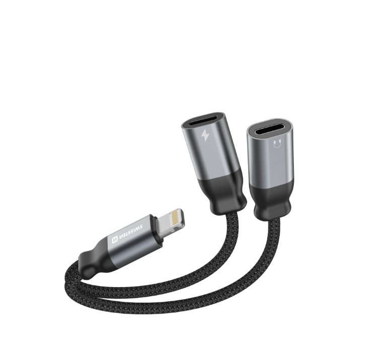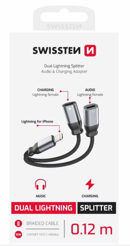 SWISSTEN NABÍJECÍ AUDIO ADAPTÉR TEXTILE LIGHTNING (samec) / 2x LIGHTNING (samice) 0,12 M ČERNÝ