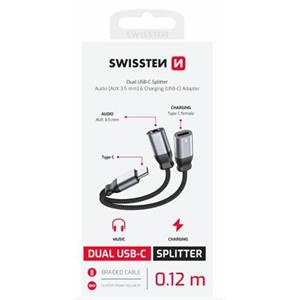 SWISSTEN NABÍJECÍ AUDIO ADAPTÉR TEXTILE USB-C (samec) / USB-C (samice) a 3,5mm AUX 0,12 M ČERNÝ