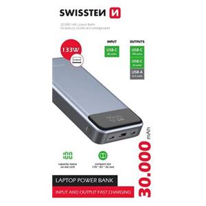 Power Banka SWISSTEN a kapacitou 30.000mAh, vstupem USB-C, výstupy 2xUSB-C, 1xUSB-A a rychlým dobíjením PD a QC s výstupním výkonem až 133W. Baleno v blistru SWISSTEN.