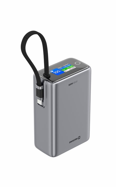 SWISSTEN POWER BANK CESTOVNÍ 25000 mAh (96.25Wh) 100W S INTEGROVANÝM KABELEM USB-C ŠEDÁ