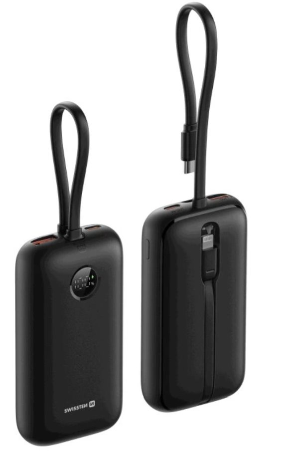 SWISSTEN POWER BANK VOLTBOX 35W 10000 mAh S INTEGROVANÝMI KABELY USB-C A LIGHTNING ČERNÁ