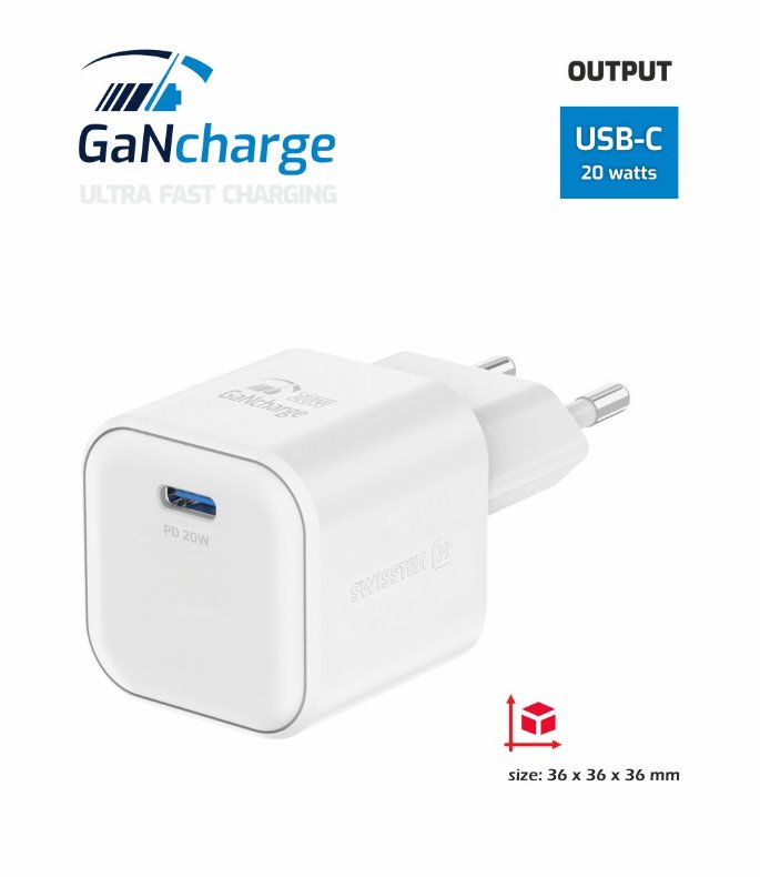 SWISSTEN SÍŤOVÝ ADAPTÉR GaN 1x USB-C 20W POWER DELIVERY BÍLÝ