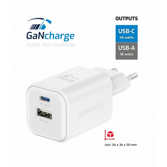 SWISSTEN SÍŤOVÝ ADAPTÉR GaN 1x USB-C 45W PD + 1x USB-A 18W QC BÍLÝ